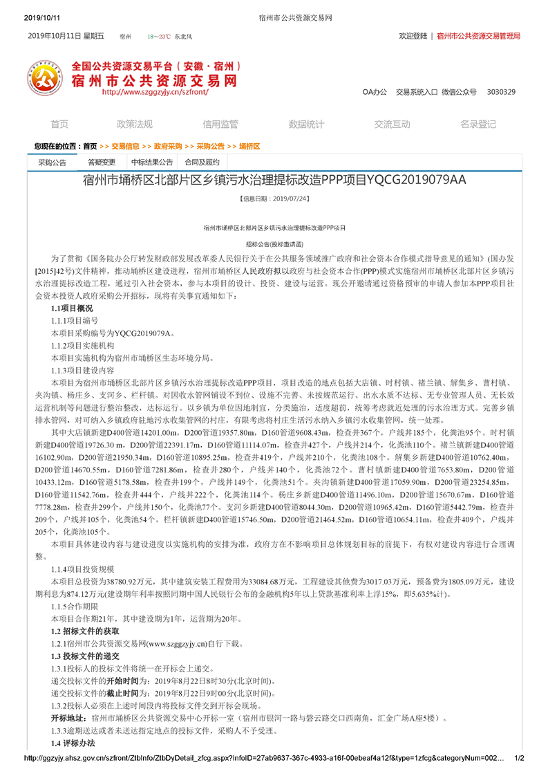 宿州市埇桥区北部片区乡镇污水治理提标改造PPP项目招标公告(投标邀请函)