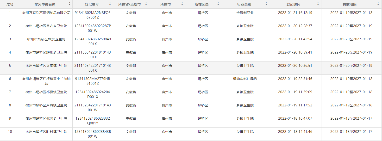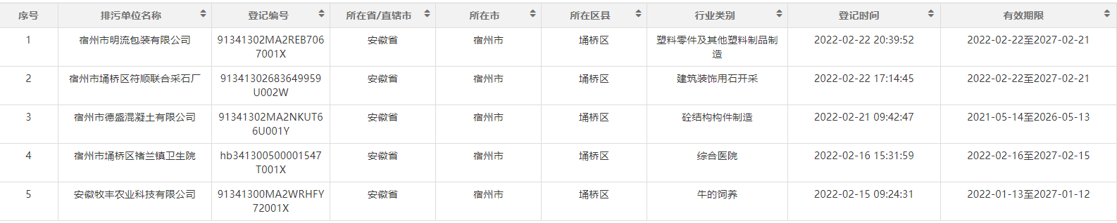 2022年埇桥区生态环境分局第一季度排污名单