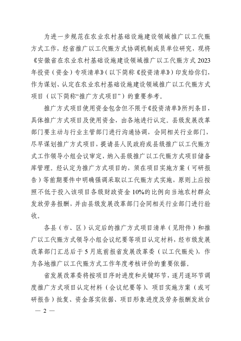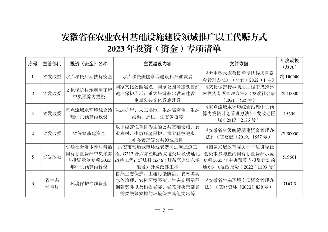 关于印发安徽省在农业农村基础设施建设领域推广以工代赈方式2023年投资(资金)专项清单的通知