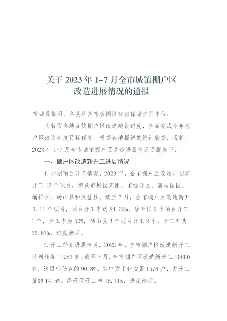 【棚户区改造】关于2023年1-7月全市城镇棚户区改造进展情况的通报