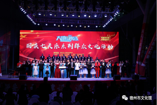 为庆祝中华人民共和国成立74周年,歌颂伟大的祖国繁荣昌盛,营造十一国庆良好节日氛围,同时为积极加入大地歌会宿州老百姓自己的盛会,欢度国庆,共赴盛会。9月30至10月6日,由中共宿州市委宣传部、宿州市文化和旅游局、宿州市广播电视台、中共宿州市直机关工委、宿州市文学艺术界联合会、埇桥区文化和旅游局主办,宿州市文化艺术中心•文化馆、埇桥区文化馆承办的“大地歌会”国庆七天乐系列群众文化活动在宿州市文化艺术中心露天剧场圆满成功。