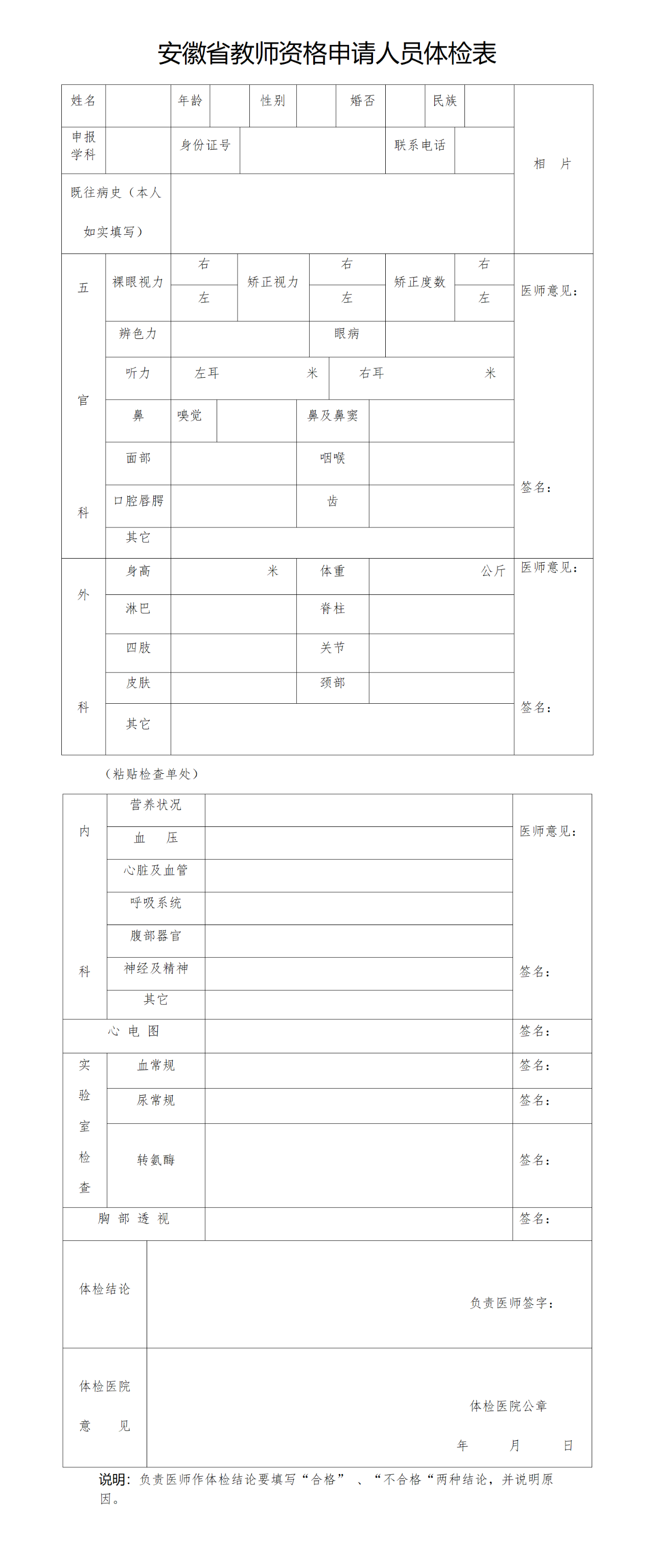 符合直接认定条件的全日制普通大中专院校师范专业毕业生须提交本人人事档案中由学籍管理部门出具的毕业生成绩登记表(含在学期间修学的教育学、教育心理学合格成绩)、教育教学实习鉴定表复印件各一份,并加盖档案管理机构(部门)印章。(6)教师资格认定机构指定的二级以上医院出具的《安徽省教师资格申请人员体检表》(附件1)、医院也有提供。体检表上的结论应明确填写“合格”或“不合格”,并加盖体检医院公章(体检当次有效)。(7)近期免冠正面1寸彩色白底证件照片2张并用回形针卡在《体检表》正面空白处。(与网上报名电子照片同版,用于办理教师资格证书。)(8)申请人申请中等职业学校实习指导教师资格的,提供相当助理工程师以上专业技术职务或中级以上工人技术等级证书原件。(9)港澳台居民申请认定教师资格须提交无犯罪记录证明。无犯罪记录证明由香港特别行政区、澳门特别行政区和台湾地区有关部门开具。其中港澳居民开具无犯罪记录证明需教育行政部门协助提供函件的,与安徽省教师资格认定指导中心联系出具。上述材料中,申请人的学历证书、普通高等院校全日制应届毕业生《教育部学籍在线验证报告》、《中小学教师资格考试合格证明》、《普通话水平测试等级证书》信息填写并经“教师资格管理信息系统”比对成功、校验通过的,现场确认时无需出示相关原件(或打印件)。教师资格认定机构根据教师资格专家审查委员会的审查意见,在受理申请期限终止之日起30个法定工作日内(节假日除外,现场确认后约一个半月)做出资格认定的结论并公示。在认定工作开展期间,申请人可登录“中国教师资格网”,查看当前认定状态等信息。经认定具备教师资格的人员,应按照宿州市教育体育局的通知要求,按时到指定地点领取教师资格证书(选择邮寄的无需到现场领取)。宿州市立医院健康体检中心(0557-3042231)、宿州市第一人民医院(刘主任:15805575136)。(注:请考生选其中一所医院参加体检,指定体检单位免费提供《体检表》,其它体检机构检查结果无效。)(一)纳入免试认定改革范围内的教育类研究生和师范生,凭《师范生教师职业能力证书》,免国家中小学教师资格考试。申请认定相应的教师资格时,认定程序不变。(二)符合安徽省直接认定条件的人员,指截止到2013年12月31日在校就读和已经毕业的全日制普通大中专院校师范专业学生,可以按原办法直接申请认定任教学科与其所学专业相一致的中小学教师资格(已取得同学科的教师资格证除外)。申请任教学科与其所学专业不一致的教师资格时,须参加国家中小学教师资格考试。(三)根据退役军人事务部、教育部、人力资源社会保障部《关于促进优秀退役军人到中小学任教的意见》(退役军人部发〔2022〕46号),退役军人在服役前1年内取得中小学教师资格考试合格证明的凭入伍通知书、退役证书等相关材料,教师资格考试合格证明有效期可延长2年。符合条件的申请人可联系认定机构,咨询办理教师资格考试合格证明有效期延长的相关事宜。(四)根据《安徽省中小学教师资格考试与认定政策解释口径》第七条,妊娠期的申请人可免检孕妇不宜的体检项目,在其他可检测项目合格的情况下,视为体检合格,但需由主检医生在体检表上签署妊娠情况说明。申请人在提交体检合格证明时需附上妊娠反应为阳性的检测报告或围产检查档案等证明材料。(五)同一申请人在同一自然年度内只能申请认定一种教师资格。(六)申请过程中,申请人应如实提交相关材料,弄虚作假,骗取教师资格的依法依规进行处理。(七)公告中提及的安徽省相关政策文件可在安徽省教育厅网站(http://jyt.ah.gov.cn/)搜索查看。其他未尽事宜详见各教师资格认定机构发布的通知公告,请申请人务必及时查阅,以免错过认定机构的工作安排。安徽省中小学教师资格考试改革过渡期已于2015年12月31日结束。特别提醒申请人注意:从2016年1月1日起,原高等教育自学考试教育学和心理学两科合格证书,不再作为申请中小学教师资格的依据。