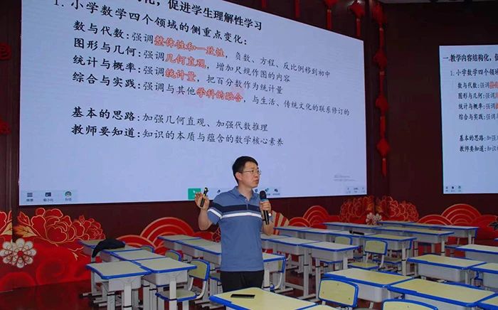 在十一中通济校区,卓越教师工作室主持人李朝志的基于核心素养命题下的中考复习策略讲座,从一张试卷说起,谈解题技巧;从一个热点谈起,说出题解题;从一本资料聊起,看资料查找进行复习策略指导。在宿州应用技术学校,卓越教师工作室主持人刘海为以《关于统编教材校本化课程开发研究》为主题,从校本教材的选择,创造性地自主开发,班级、学校改革与实验,分享了自己的教科研策略。在宿州市第十二小学,埇桥区教研室教研员孙浩为与会老师开设了一场《新课标背景下小学数学课堂教学理念及方式的转变》的专题讲座,结合两节展示课,向与会老师们介绍了小学数学的新理念以及如何转变传统的教学方式、设计探究型问题,让学生成为课堂的主人。一场场讲座中,埇桥教师在教学素养和教学理论上得到了极大提升。