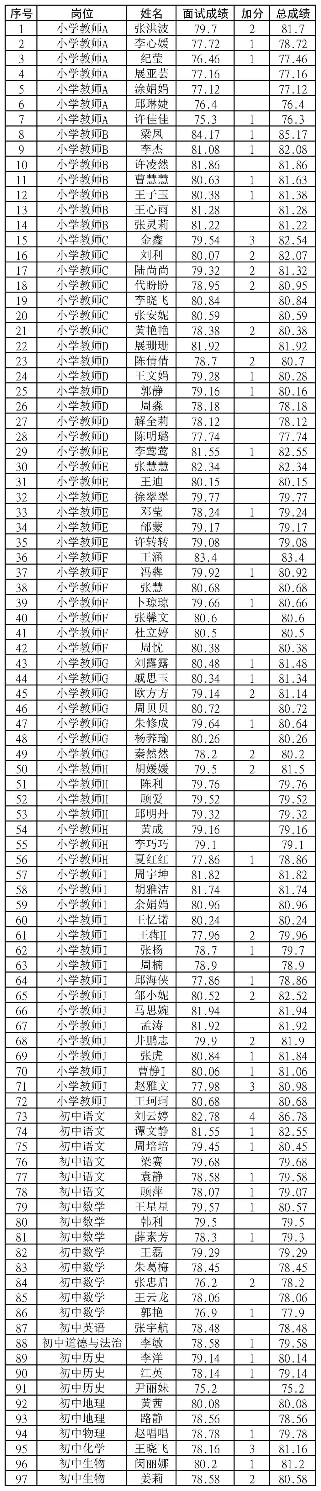 根据《埇桥区2024年公开引进区外在编在职教师公告》要求,同一岗位内,根据引进计划按1:1比例,最终以总成绩(面试分数+加分)从高分到低分顺序确定拟引进教师名单。最后一名若成绩相同,按照加分高者在先;加分相同者依获得的表彰荣誉级别高者在先;如果再相同则采取加试的方法确定体检考察对象,加试方案另行公布。拟引进教师名单在宿州市教育体育局官网公布,公布后10日内,拟引进教师须提供所在地人社部门、编制部门同意并盖章的《埇桥区2024年公开引进区外在编在职教师申请表》,逾期不能提供的(截止2024年8月15日17:30分),视为自动放弃,不予进入体检、考察环节,由此出现人选缺额的,按照规定程序,在同一岗位报考人员中,按照总成绩从高分到低分依次等额递补。