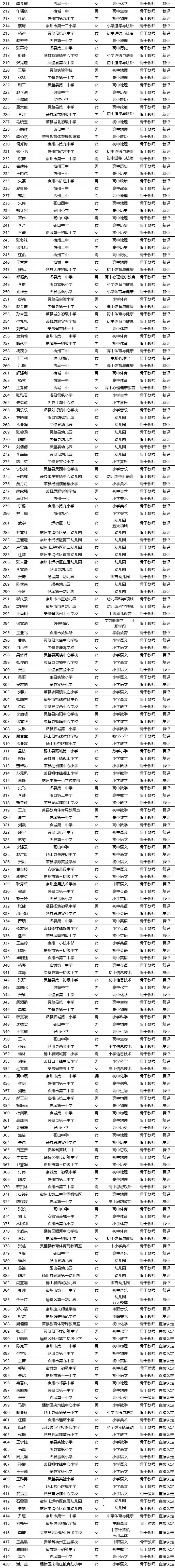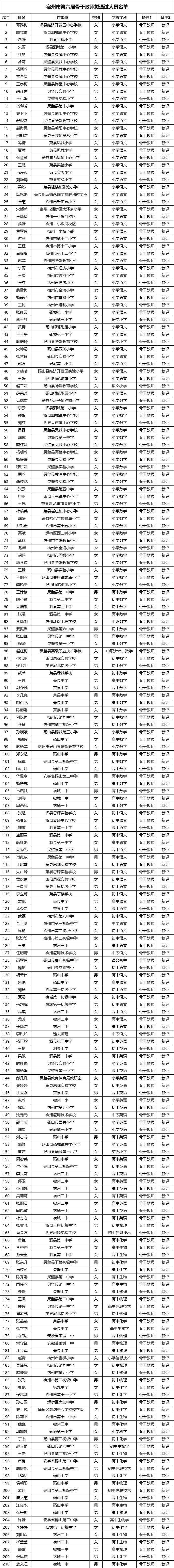 宿州市第六届学科带头人、骨干教师拟通过人员名单公示