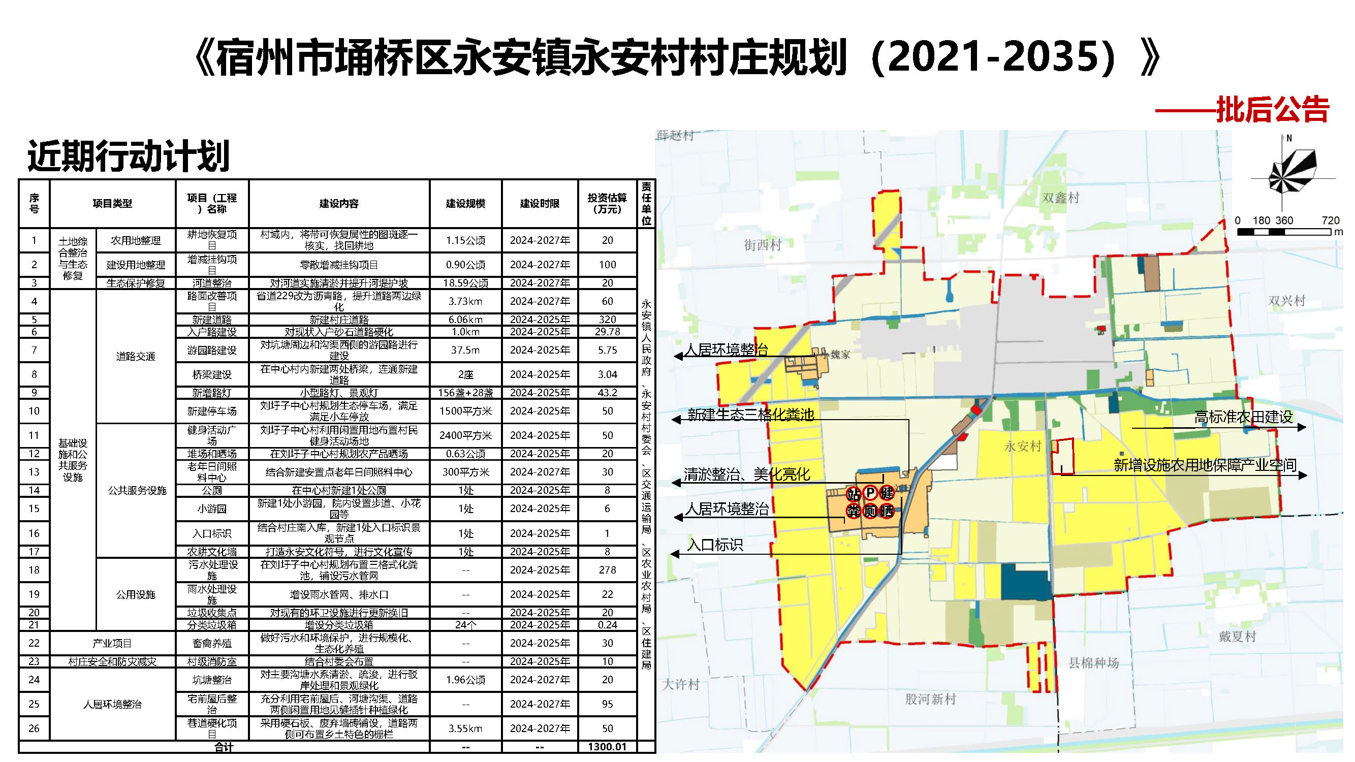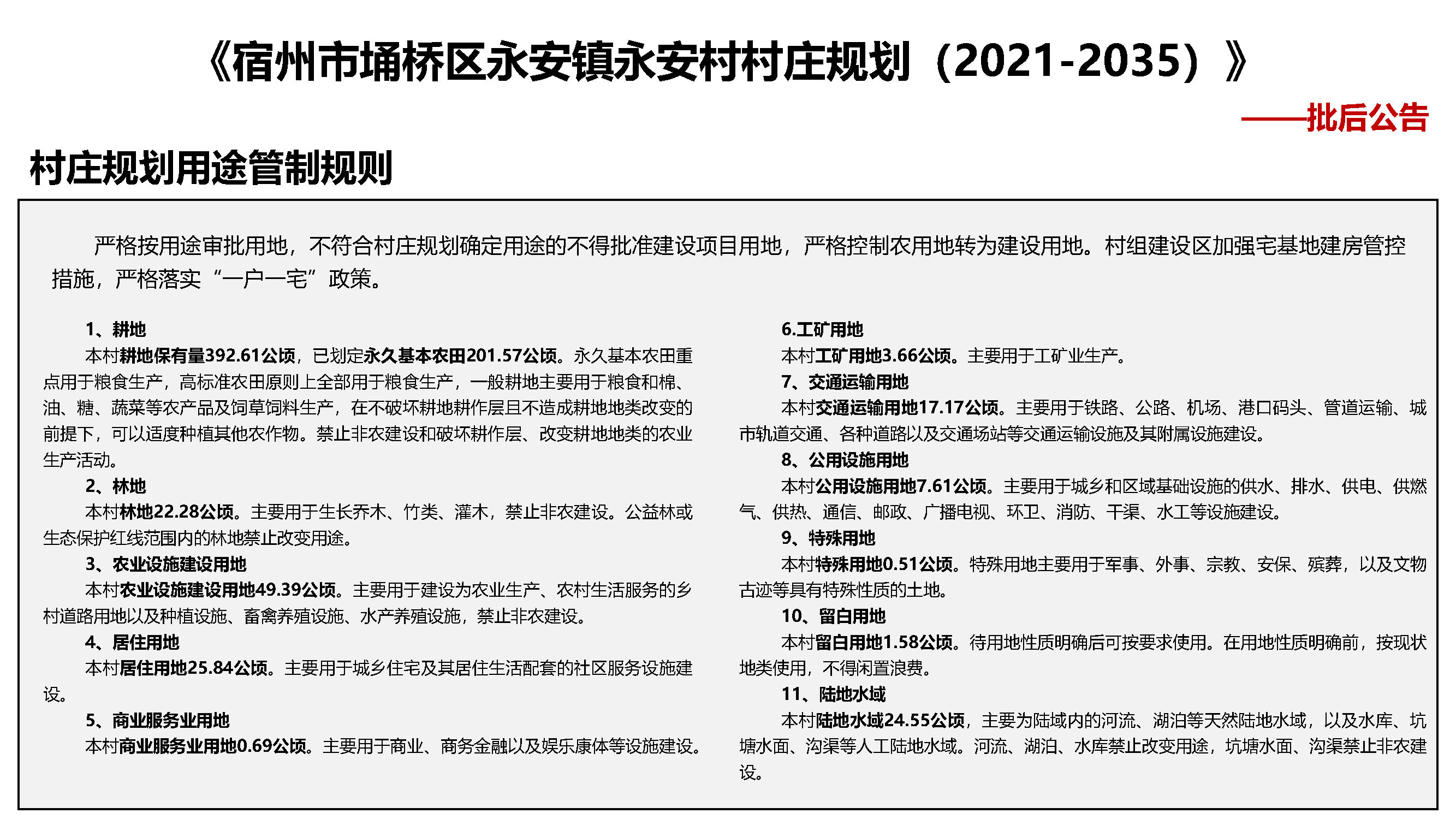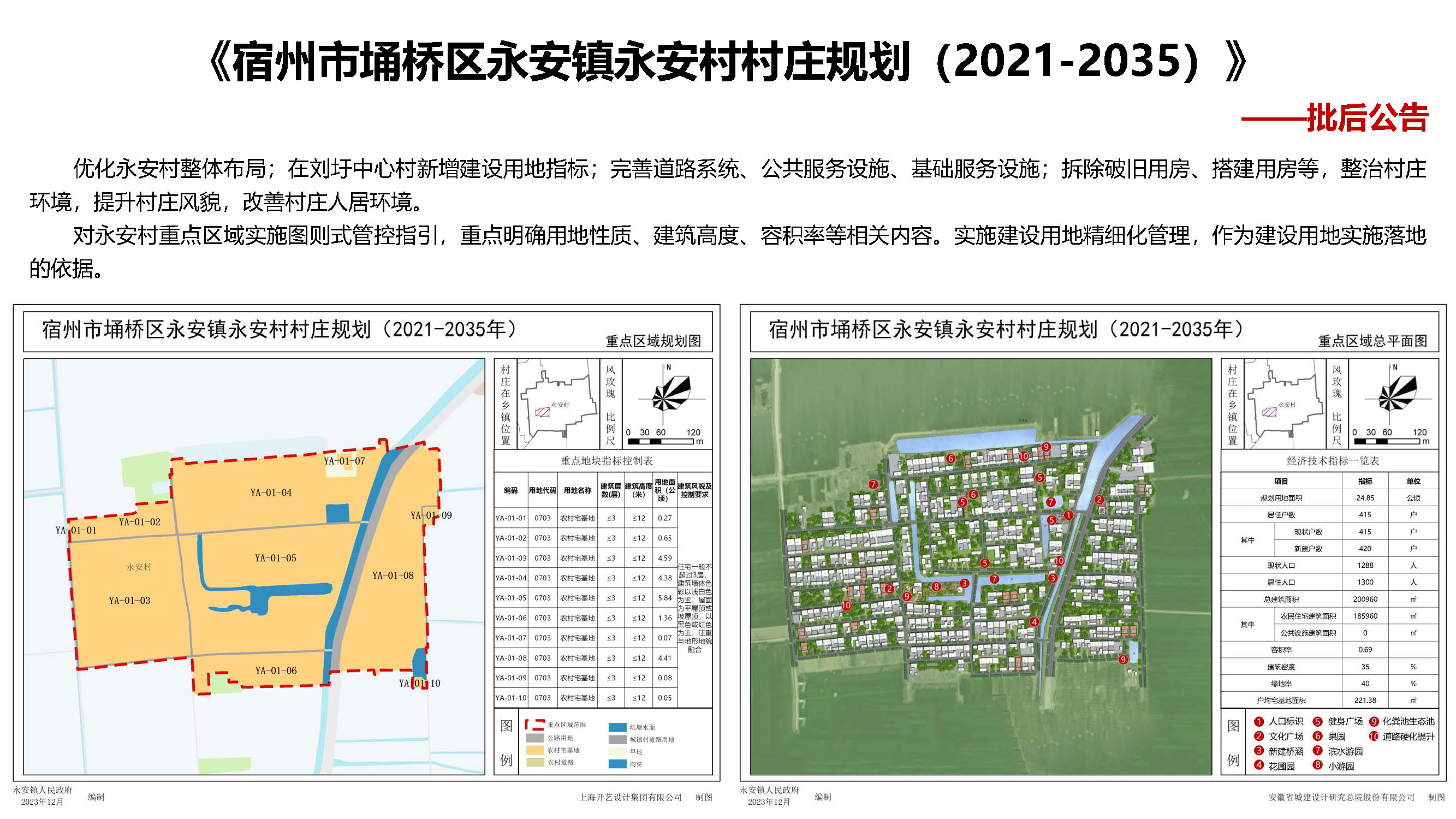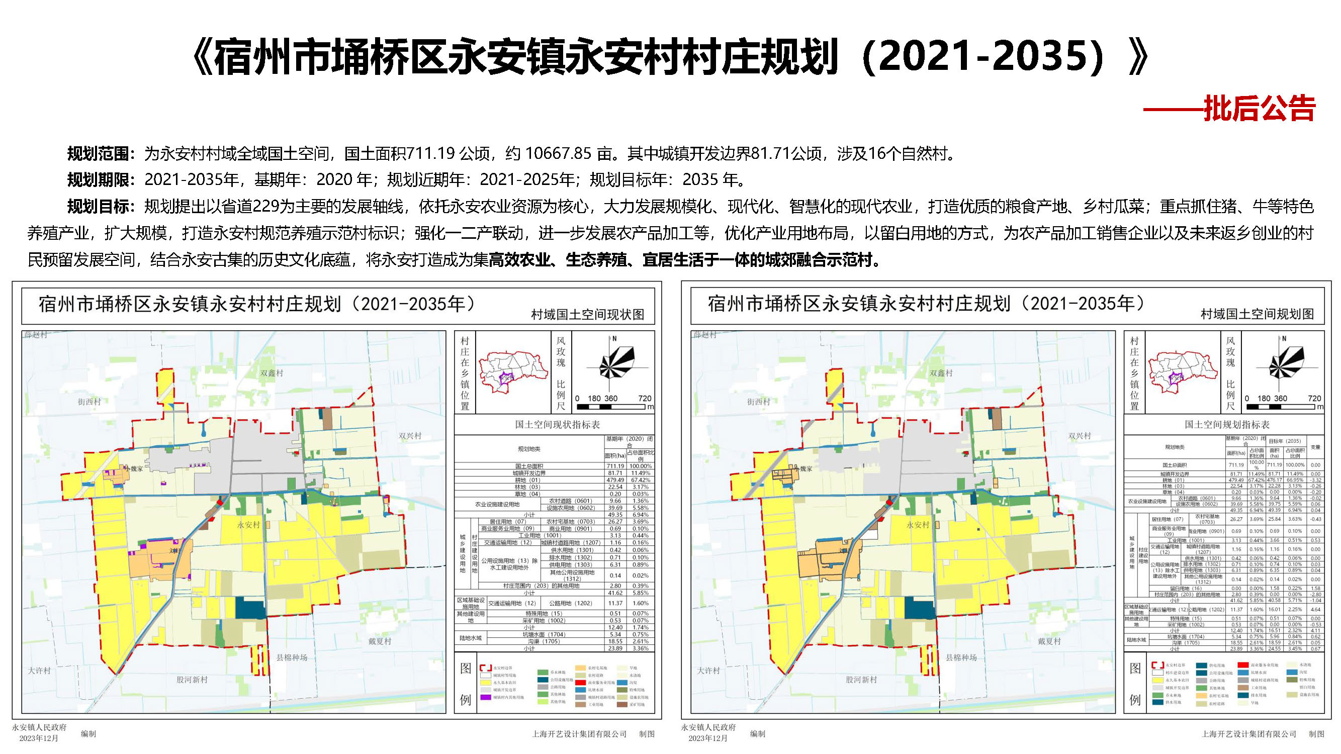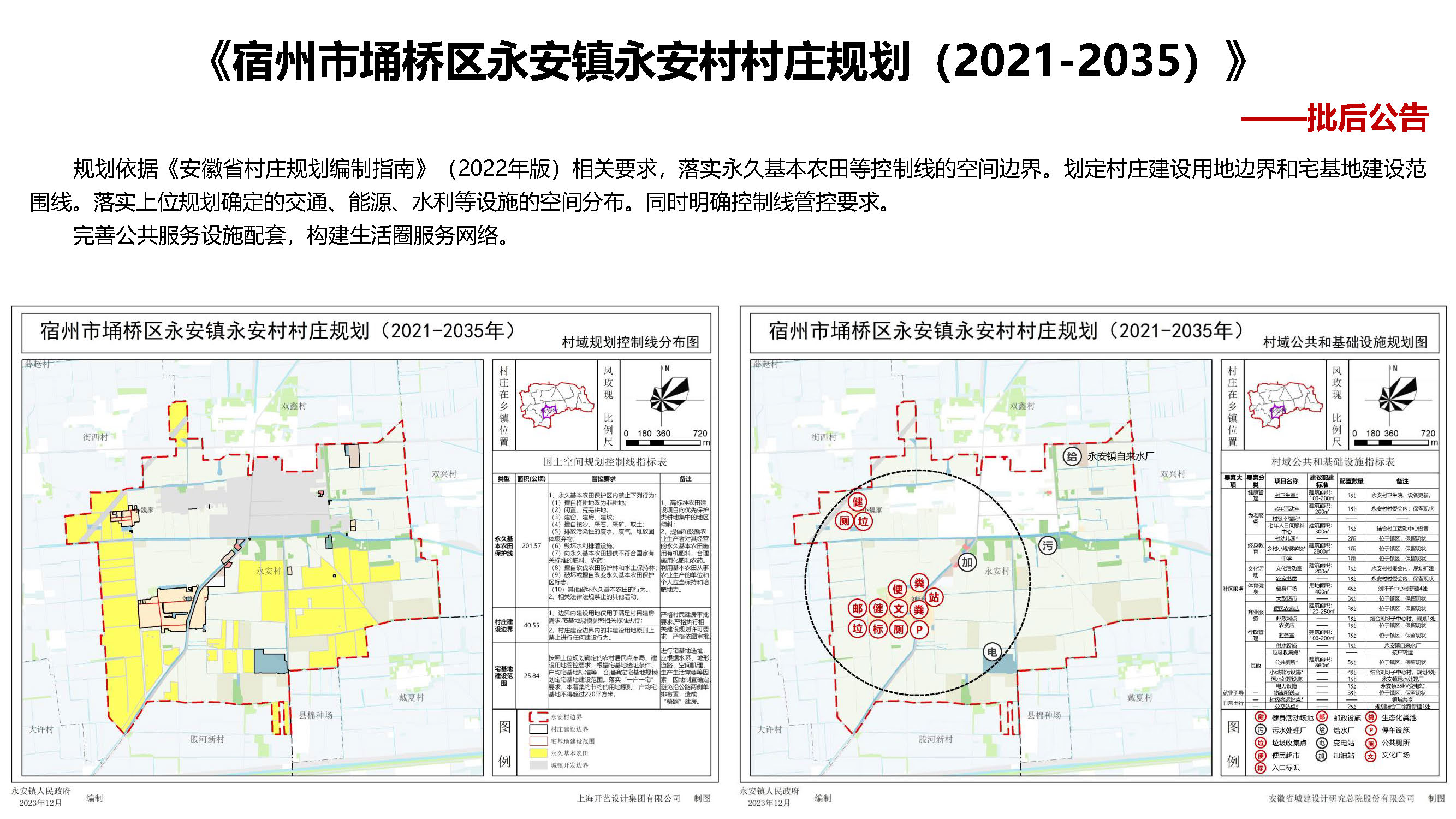 经过征求各方意见并修改完善,《宿州市埇桥区永安镇永安村村庄规划(2021-2035 年)》成果已取得宿州市埇桥区人民政府批复。根据《中华人民共和国土地管理法》、《中华人民共和国城乡规划法》规定和《安徽省村庄规划编制指南(2022年版)》、《国土空间规划公示公开规定(暂行)》等要求,现予公告。