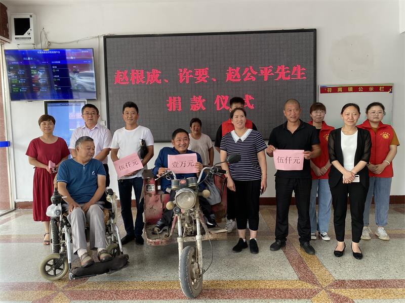 7月27日上午,符离镇振兴居委会居民赵根成、赵公平、许要带着两万元爱心捐款来到了镇政府。“我们曾经都得到过政府的帮助和支持,现在有能力了,也想献出自己的一份力量帮助其他困难家庭”捐款代表赵根成说。