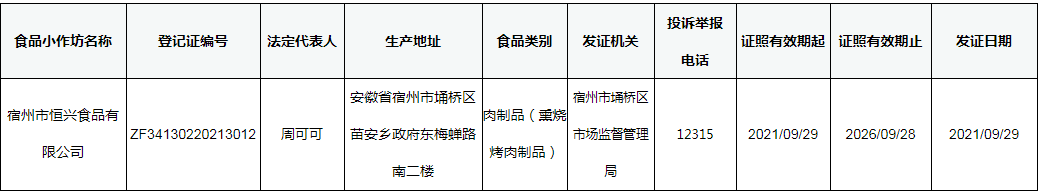 【小作坊】2021年10月埇桥区市场监督管理局食品小作坊备案基本信息公示表