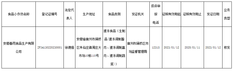 2023年1月埇桥区市场监督管理局食品小作坊备案基本信息公示表
