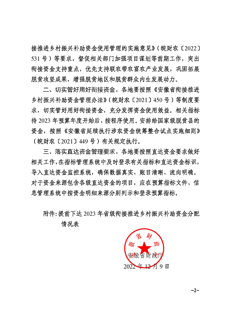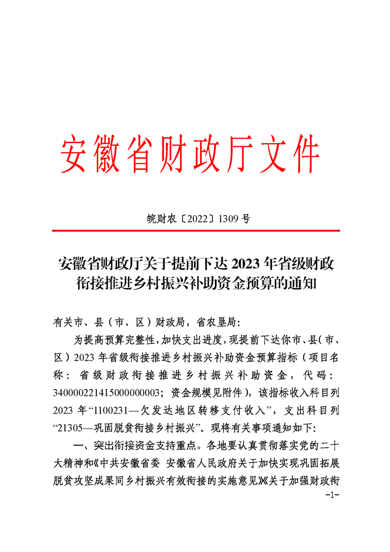 【省级政策】安徽省财政厅关于提前下达2023年省级财政衔接推进乡村振兴补助资金预算的通知