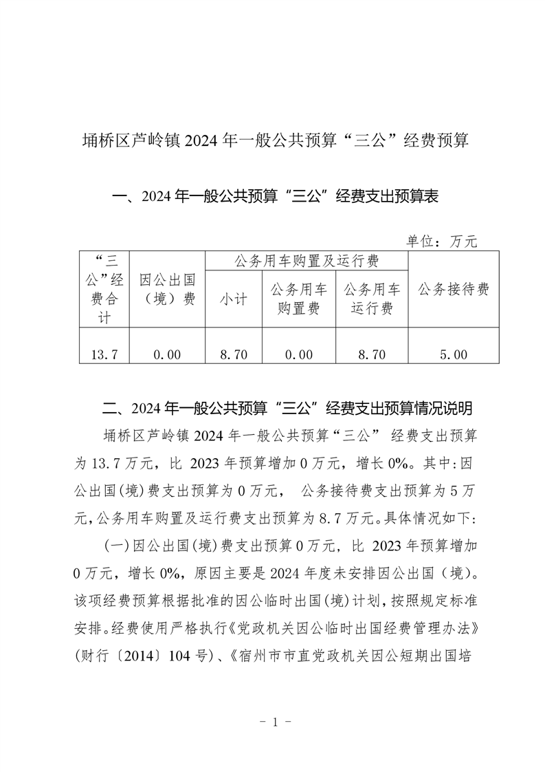埇桥区芦岭镇2024年一般公共预算“三公”经费预算