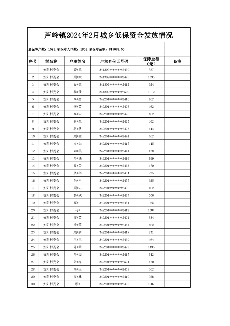 芦岭镇2024年2月城乡低保资金发放情况