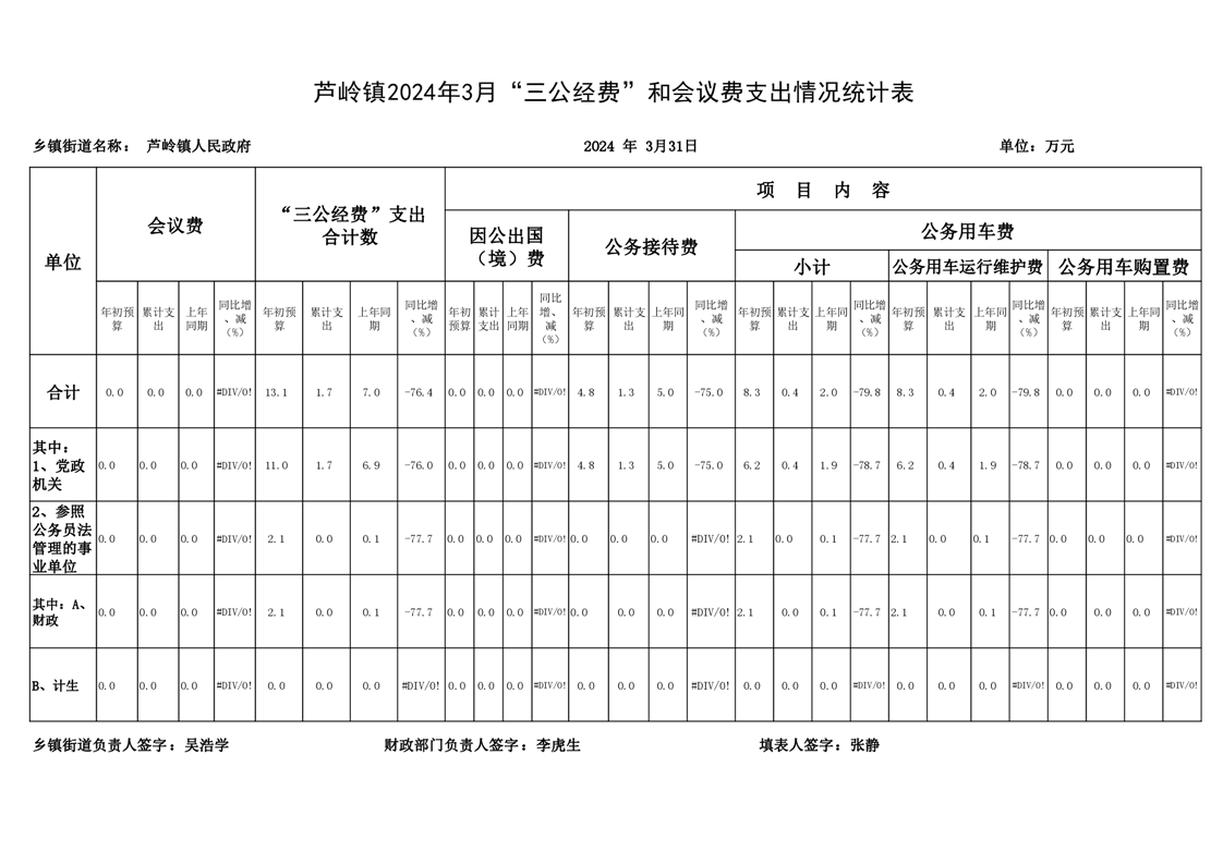 芦岭镇2024年3月“三公“经费和会议费支出情况统计表