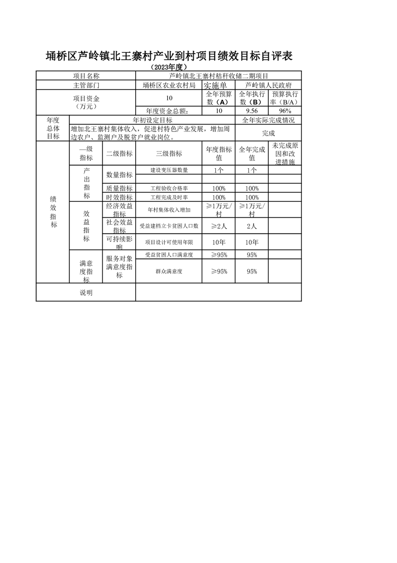 芦岭镇2023年产业到村项目资金绩效目标自评表