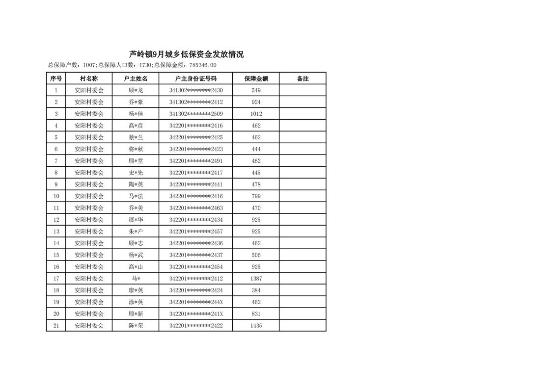 芦岭镇2024年9月城乡低保资金发放情况