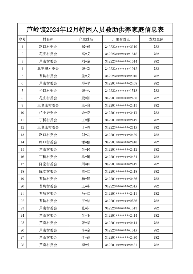 芦岭镇2024年12月特困人员救助供养家庭信息列表