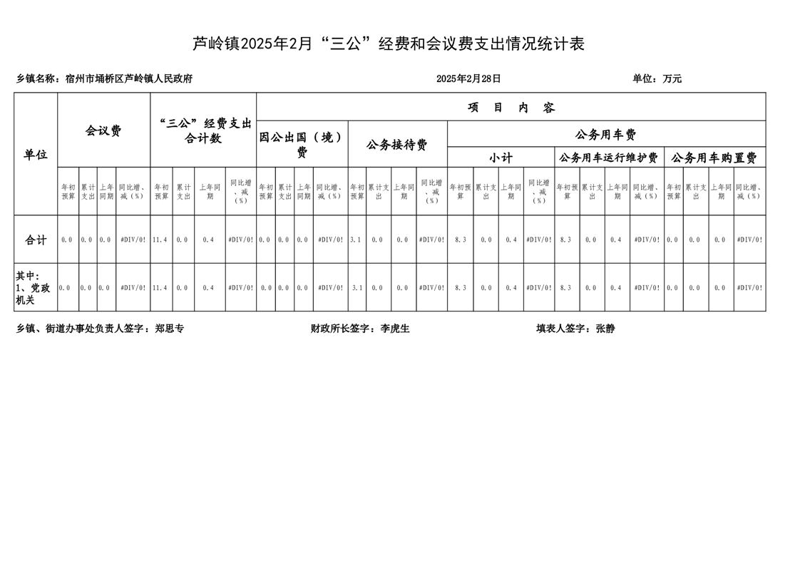 芦岭镇2025年2月“三公”经费和会议费支出情况统计表