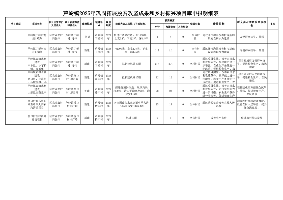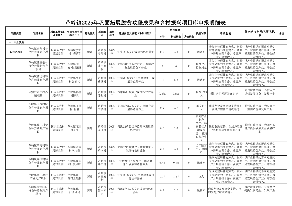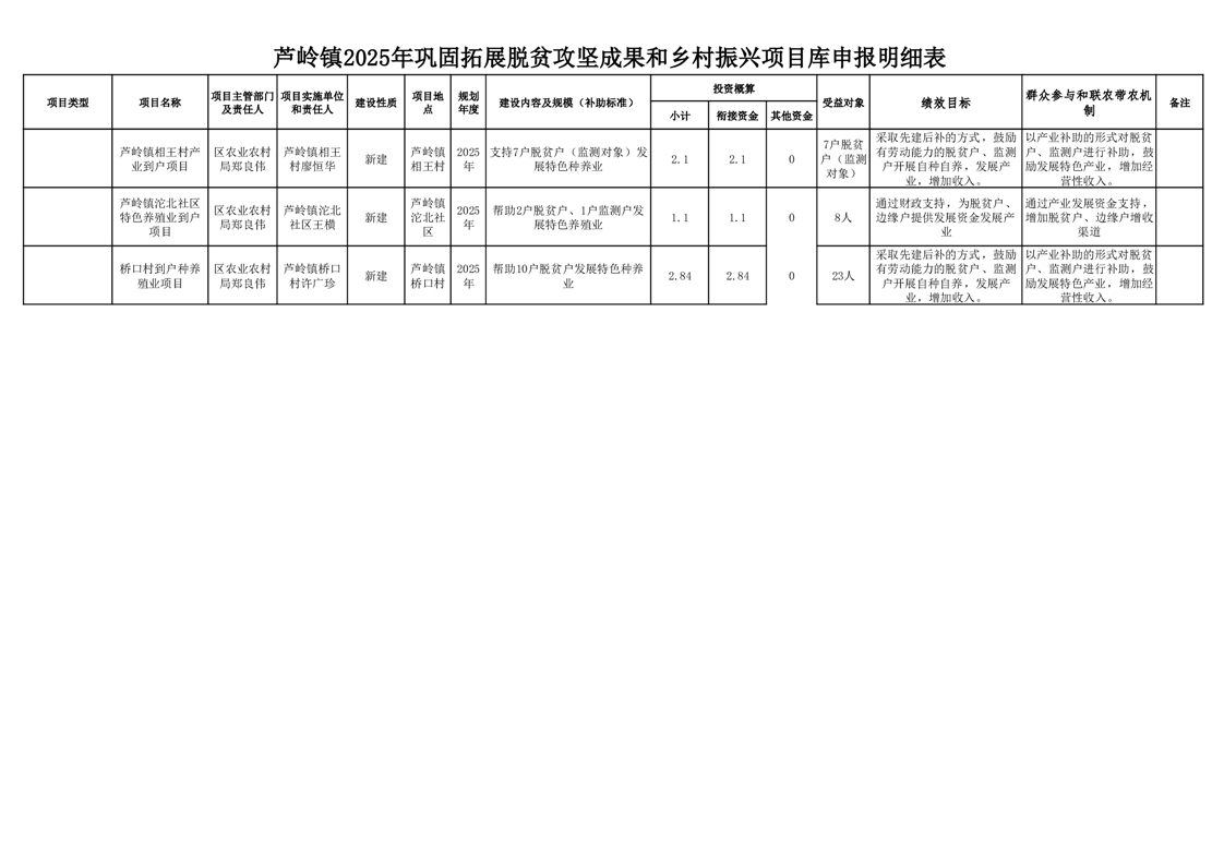 芦岭镇2025年巩固拓展脱贫攻坚成果和乡村振兴项目库申报明细表