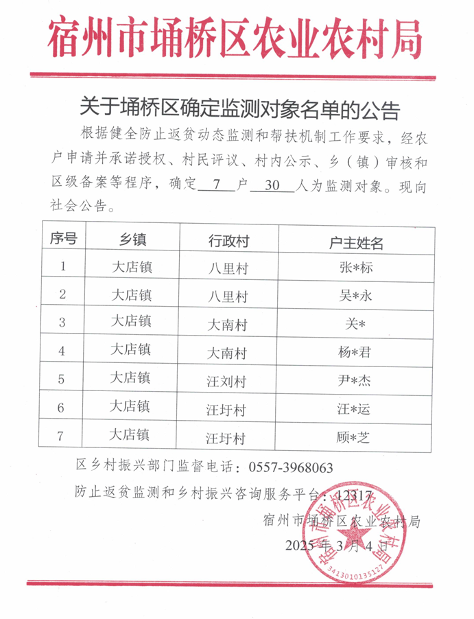 关于埇桥区确定监测对象名单的公告