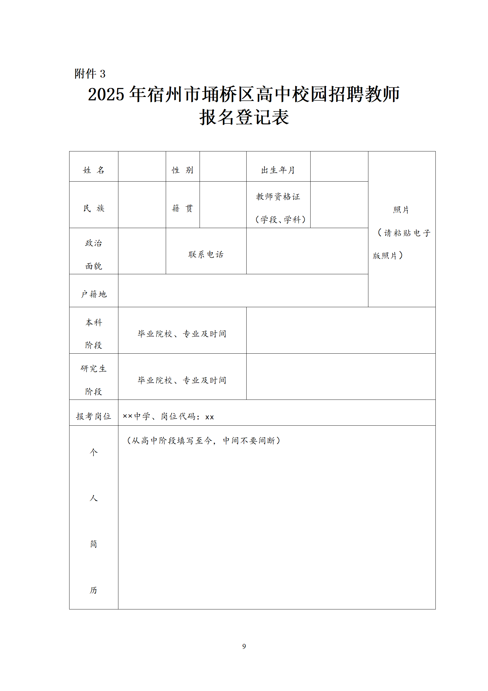2.2025年宿州市埇桥区高中校园招聘教师岗位计划表3.2025年宿州市埇桥区高中校园招聘教师报名登记表