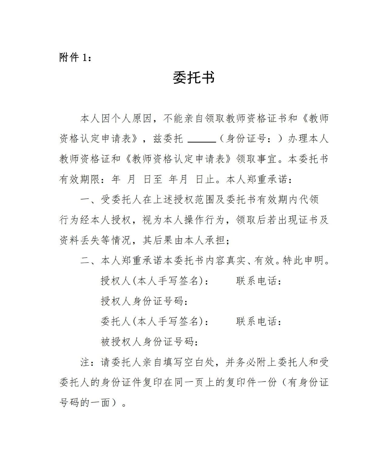 1、请本人携带身份证原件领取证书;若因特殊原因,不能本人领取教师资格证书,委托他人领取的,请认真填写委托书(需委托人、委托办理人签字)、委托办理人的有效身份证原件、复印件及委托人有效身份证原件、复印件 (委托书见附件1,名单见附件2) 。