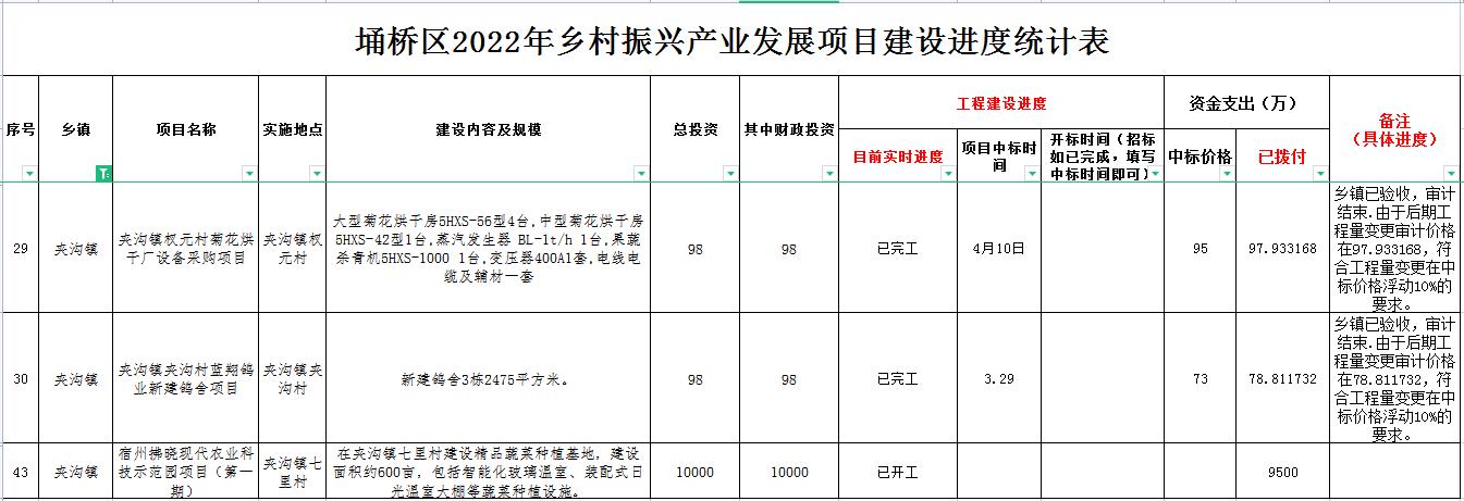 埇桥区夹沟镇2022年乡村振兴产业发展项目建设进度统计表
