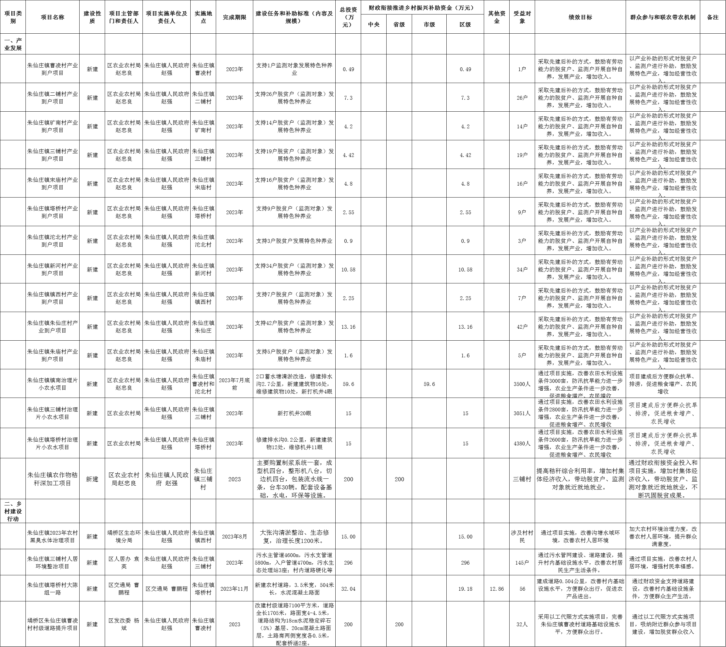 朱仙庄镇2023年财政衔接推进乡村振兴补助资金项目明细表