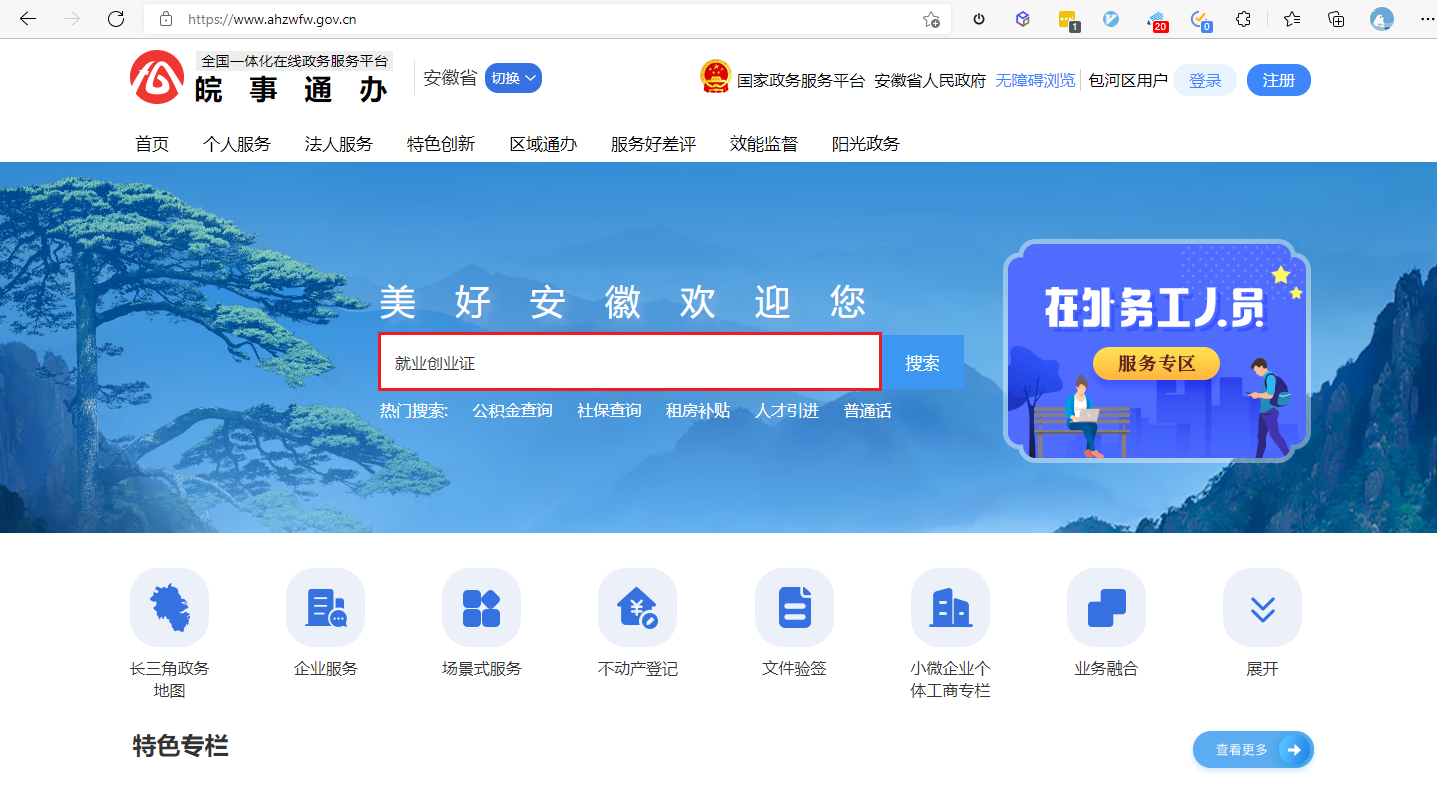 1.打开安徽政务服务网,在搜索框中搜索“就业创业证”。
