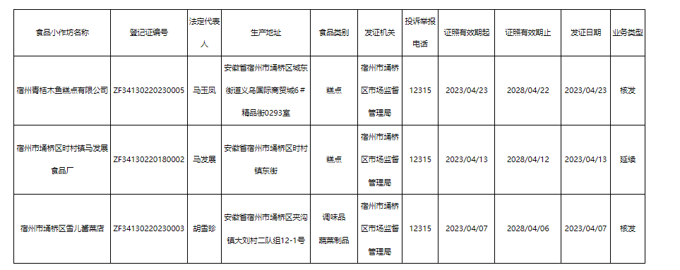 2023年4月埇桥区市场监督管理局食品小作坊备案基本信息公示表