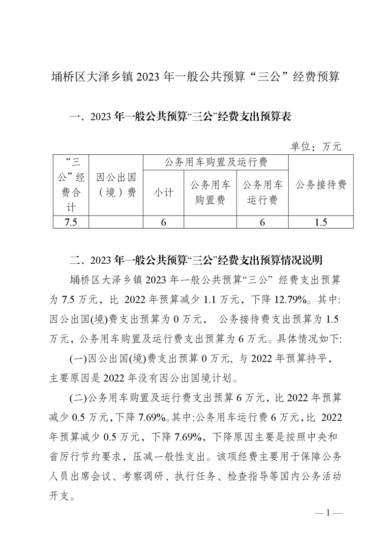 宿州市埇桥区大泽乡镇2023年度一般公共预算财政拨款“三公”经费预算