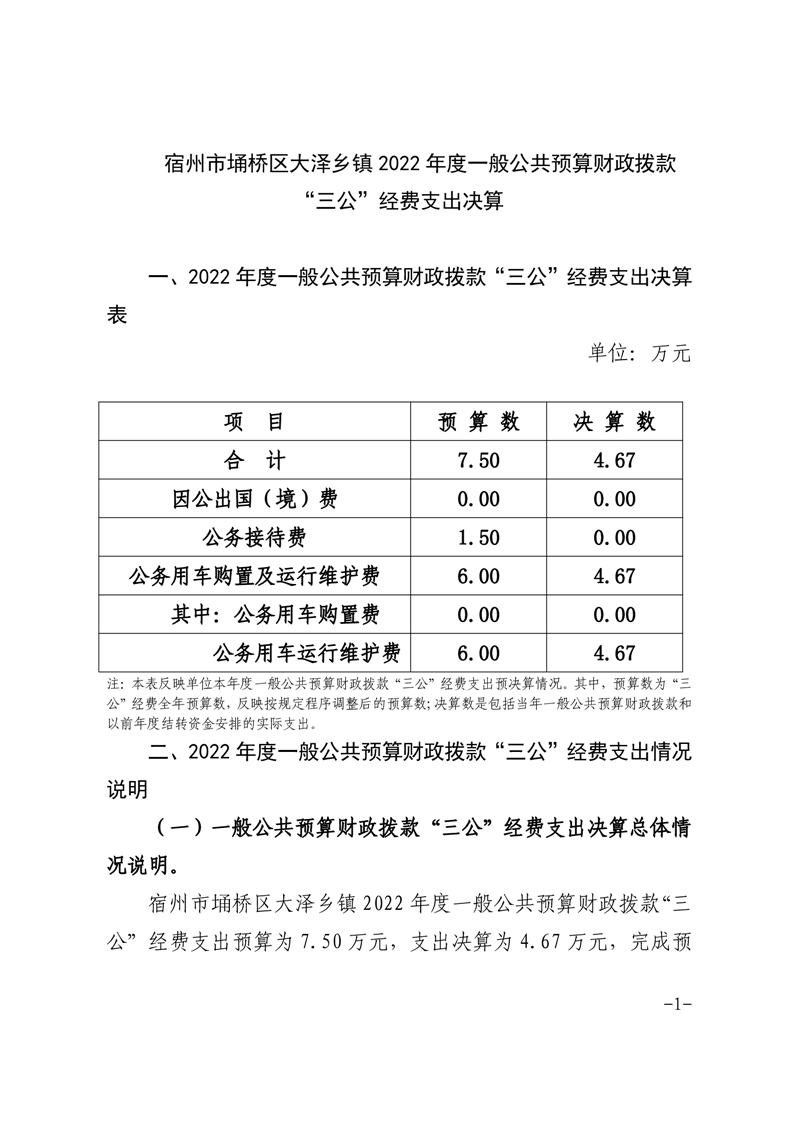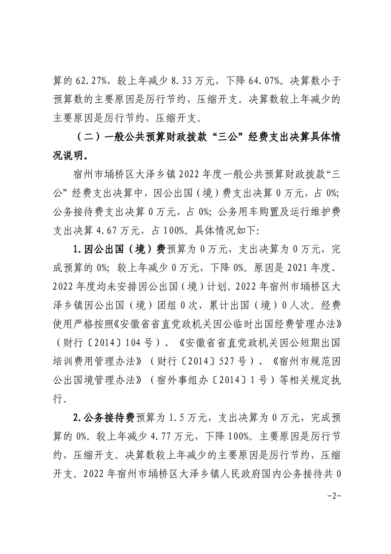 宿州市埇桥区大泽乡镇2022年度一般公共预算财政拨款“三公”经费支出决算情况说明