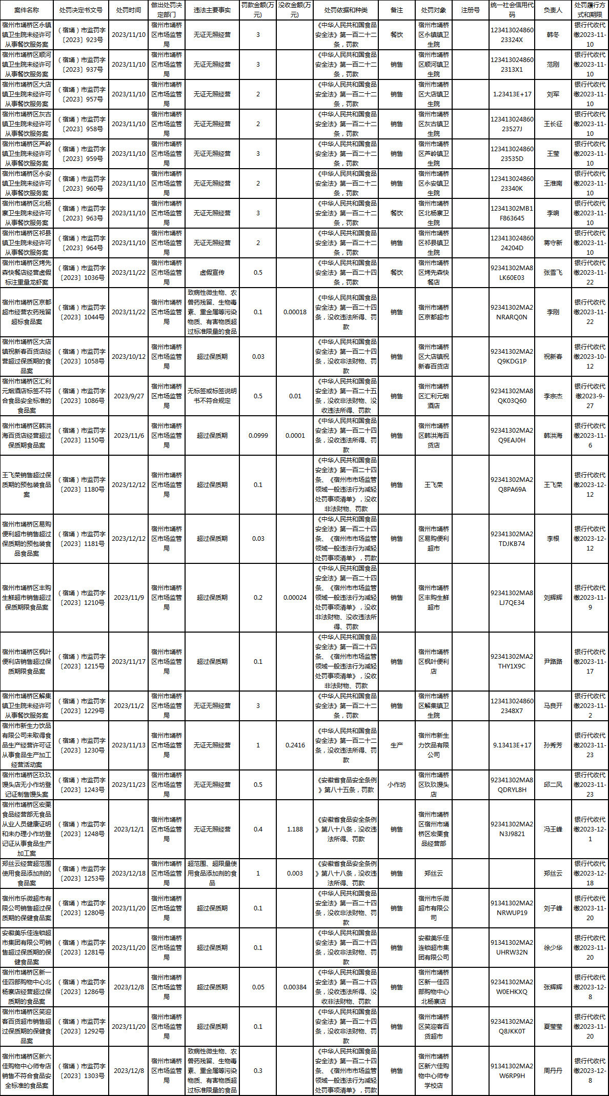 【行政处罚】埇桥区市场监督管理局2023年12月份行政处罚案件信息及违规企业名单公开表
