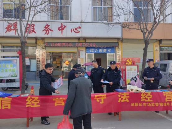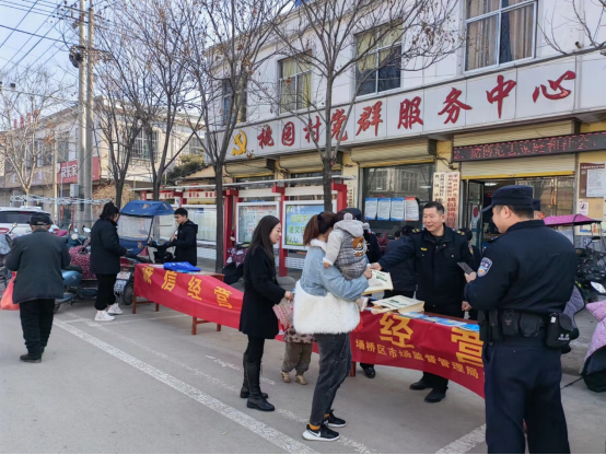 当日上午,阳光普照,万物复苏,在镇党委政府的统一部署下,桃园镇食安办、派出所、法庭等单位配合桃园镇市场监管所在桃园村委会门口设立咨询台,接受群众咨询;市监所工作人员在桃园村委会门口悬挂“诚信经营 守法经营”等宣传标语,解答群众问题;通过散发宣传资料、宣讲消费者权益法知识和食品安全法知识等形式,积极营造浓厚的维权氛围。