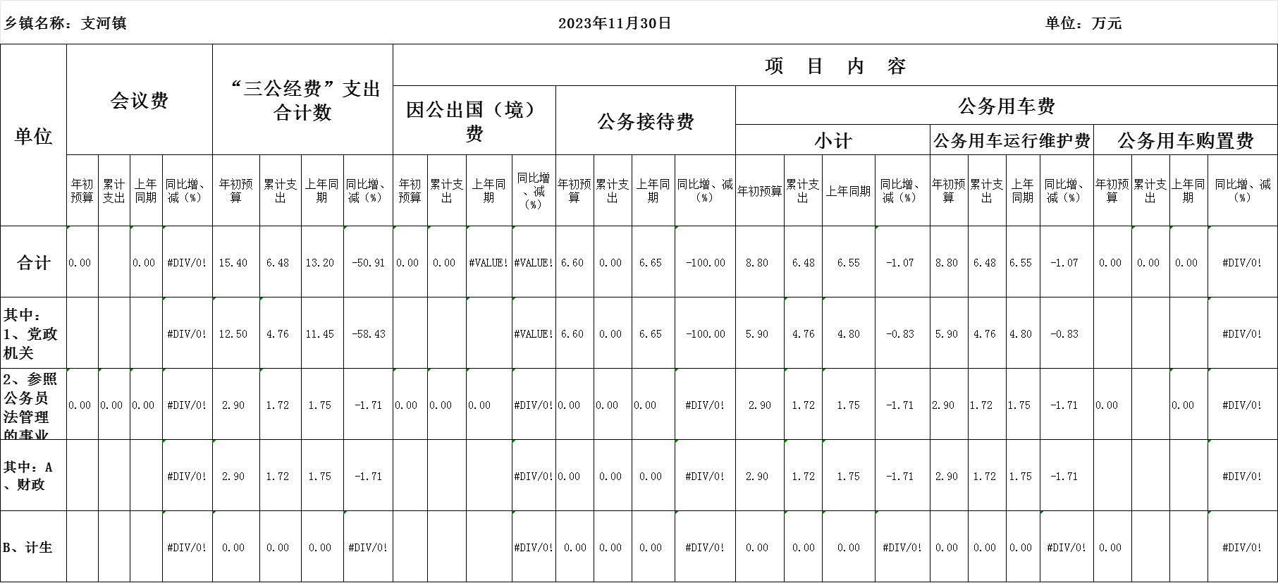 支河镇2023年11月“三公”经费和会议费支出情况统计表