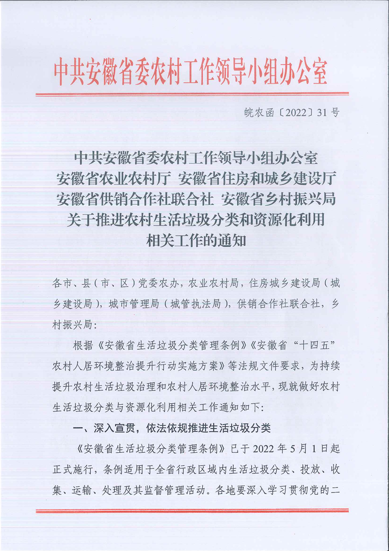 省委农办省农业农村厅省住建厅省供销社省乡村振兴局关于推进农村生活垃圾分类和资源化利用相关工作的通知
