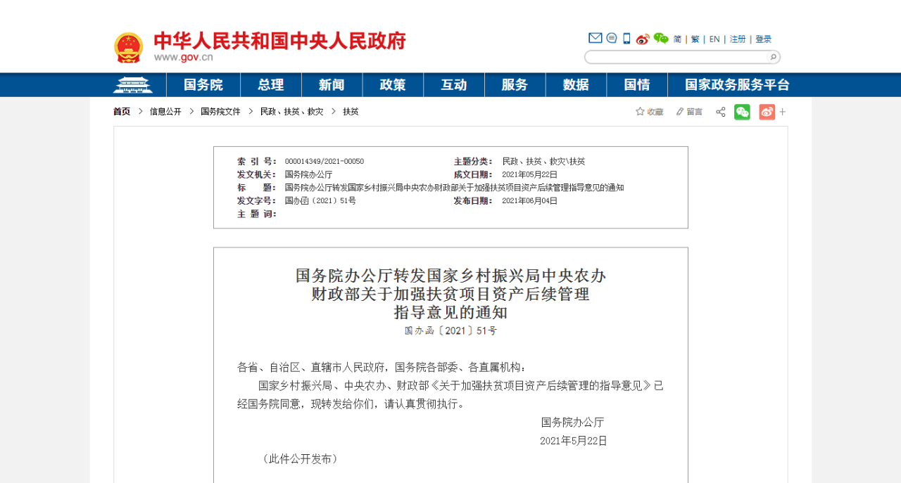 国家乡村振兴局、中央农办、财政部《关于加强扶贫项目资产后续管理的指导意见》已经国务院同意,现转发给你们,请认真贯彻执行。