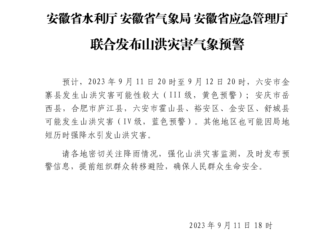 预计,2023年9月11日20时至9月12日20时,六安市金寨县发生山洪灾害可能性较大(III级,黄色预警);安庆市岳西县,合肥市庐江县,六安市霍山县、裕安区、金安区、舒城县可能发生山洪灾害(IV级,蓝色预警)。其他地区也可能因局地短历时强降水引发山洪灾害。请各地密切关注降雨情况,强化山洪灾害监测,及时发布预警信息,提前组织群众转移避险,确保人民群众生命安全。