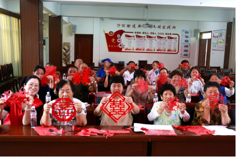 活动现场,剪纸志愿者向居民群众讲解了七夕的由来和习俗,分享了“乞巧”的含义和牛郎织女的爱情故事,并从剪纸的历史、文化、方法、用途、寓意等多个方面向大家介绍了剪纸艺术的文化特色。 随后,剪纸志愿者手把手、面对面的为居民耐心地讲解剪纸需要注意的步骤和技巧,大家围坐桌边,一边热烈讨论着剪纸的技巧,一边亲手实践,一张张普通的红纸被居民们的巧手赋予了新的意义,变成一幅幅漂亮的剪纸作品。