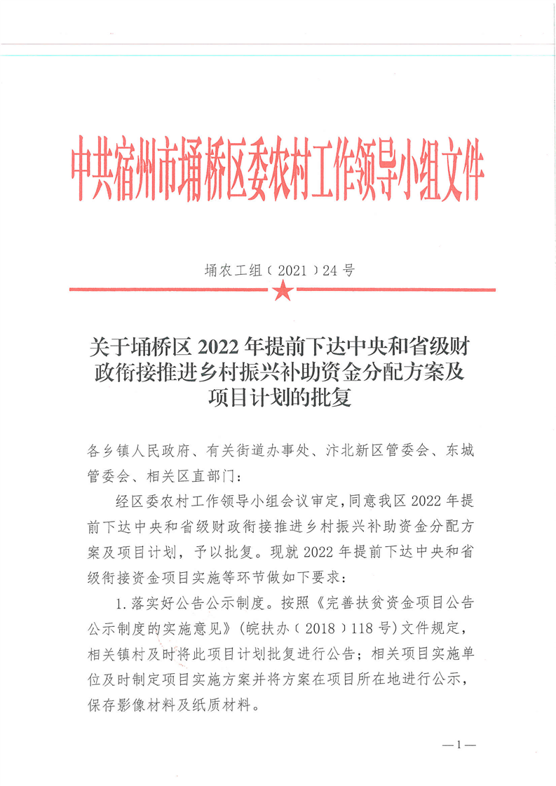 关于埇桥区2022年提前下达中央和省级财政衔接推进乡村振兴补助资金分配方案及项目计划的批复