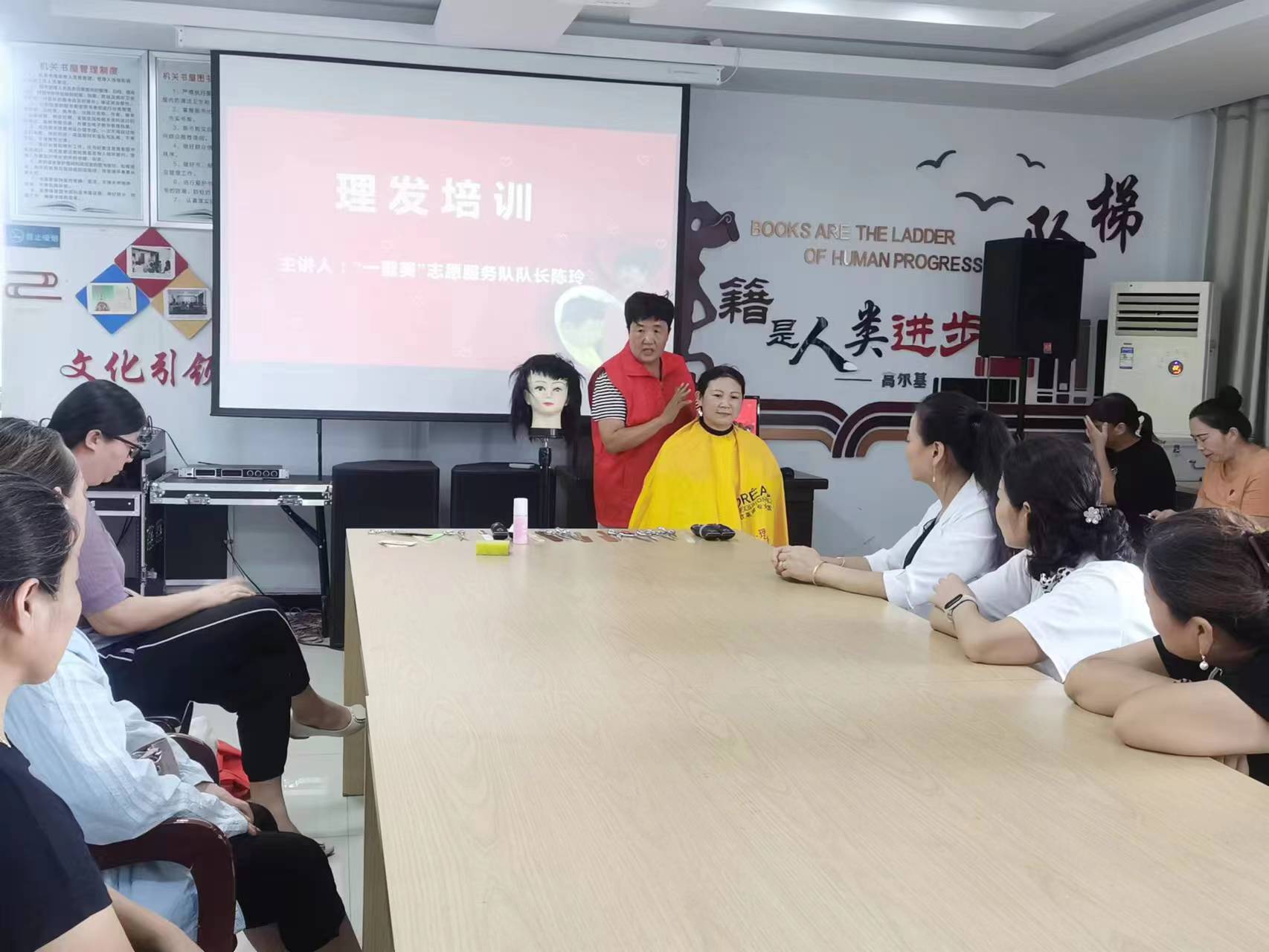 志愿服务队队长陈玲担任此次培训课主讲,为大家讲述具体理发技巧,一位志愿者充当模特,陈大姐一边为她理发一边讲述每个步骤的注意事项,学员们互帮互助,相互交流、讨论经验。
