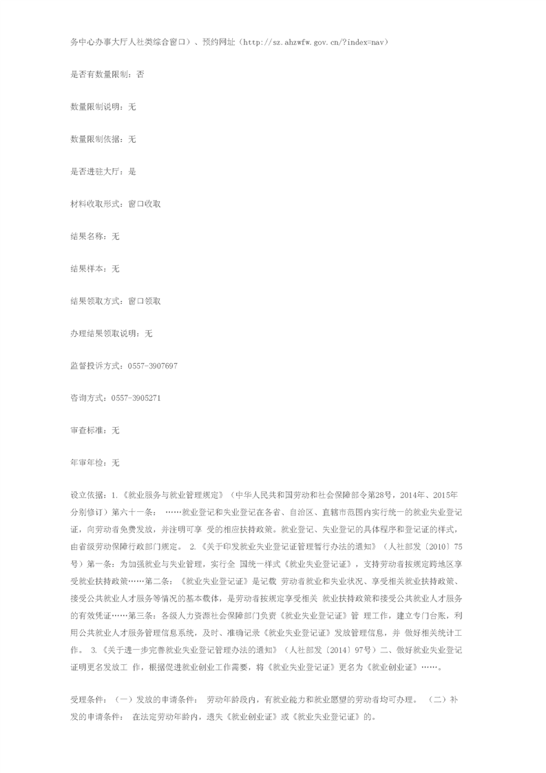 1.《关于印发<安徽省就业失业登记证管理实施细则(暂行)的通知>》(皖人社发〔2010〕87号)第六条:劳动者或用人单位首次进行求职登记、就业登记、失业登记时发放《就业失业登记证》。
