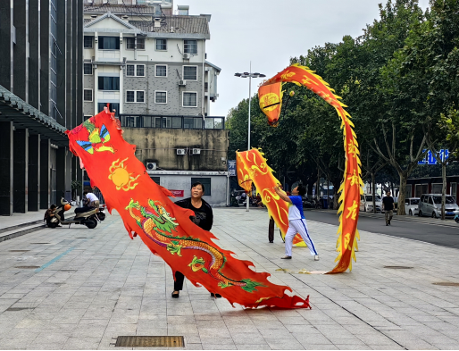 活动现场,舞龙爱好者舞起手中的“彩带龙”精气神十足,色彩鲜艳的龙绸在空中时而辗转盘旋,时而飞龙上天。舞龙者是通过手臂的摆动、脚步的移动、腰部的扭动等身体多部位的动作协调配合,让彩绸随着龙头的摆动腾起,如龙飞九天一般,是适宜大众参与、有益于身心健康的一种单人舞龙运动形式。
