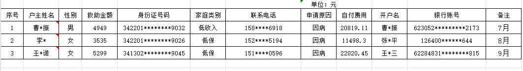 北杨寨管委会2023年第三季度临时救助拨款花名册
