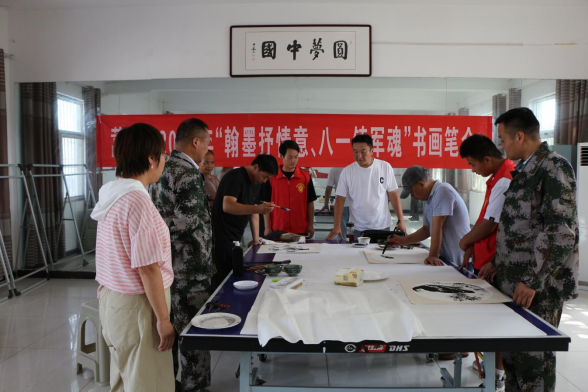 6.活动内容:为进一步引导广大村民群众铭记革命历史、赓续红色血脉,在蒿沟镇新时代文明实践所的文化活动室内,蒿沟镇文化站、退役军人服务站联合举办以“翰墨抒情意 八一铸军魂”为主题的书画笔会活动。活动中,10余名书画家和退役军人正在一边创作一边交流。