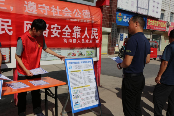 在网络安全宣传周期间,蒿沟镇宣传办、团委、司法所组成宣传小分队,在镇政府前开展网络安全宣传活动,向过往群众分发宣传手册、宣传彩页,讲解网络安全的重要性。同时,依托新时代文明实践所(站)开展网络安全知识讲座,组织一些村民,一同学习和探讨文明网络、清朗网络等相关问题。